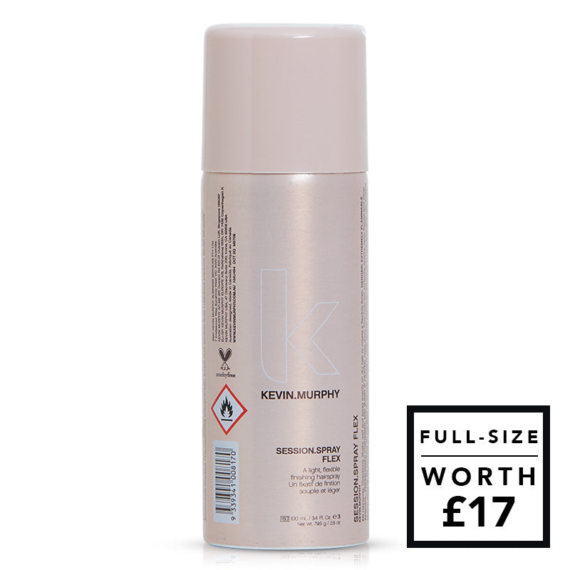 Discover flexible, workable, long-lasting hold without the crunch with this lightweight finishing hairspray. Enriched with olive leaf extract for strength, grape seed oil for moisture and shine and green tea extracts for resilience and elasticity. KEVIN MURPHY SESSION SPRAY FLEX is frizz reducing, anti-static and never flaky, breathing new life (and style) into your hair. Suitable for all hair types the weightless spray is quick to dry, soft, flexible yet still holds its shape for natural looking styles.