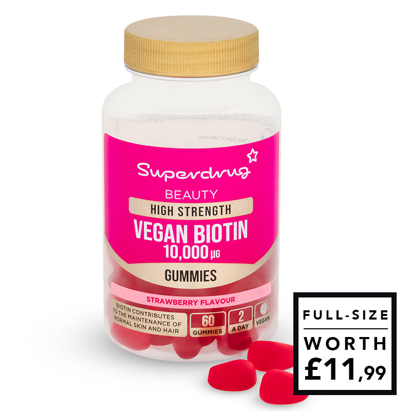 Superdrug High Strength Vegan Biotin 10,000µg Strawberry Gummies offer a convenient way to support skin, hair and overall wellbeing with Biotin contributing to normal psychological and nervous system function as well as energy-yielding metabolism. Free from artificial colours, flavours and preservatives, these chewable gummies are suitable for adults and children over 12. Simply take two daily. Contains sugar. Do not exceed the recommended dose and consult a healthcare professional if pregnant, breastfeeding or taking medication.